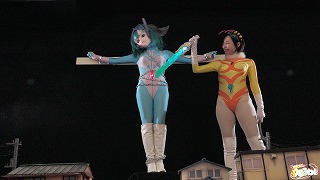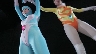素顔のピンチシーンがお好きな方は「素顔の巨大戦士レイvs巨大ハチ女カイ」をご覧ください)